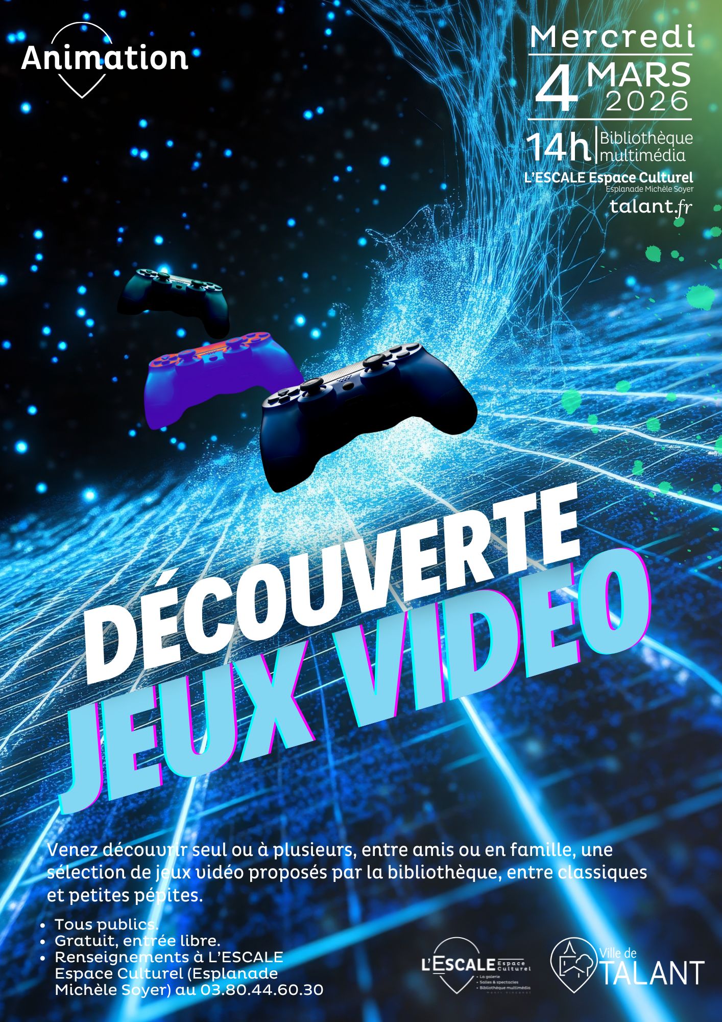L'ESCALE - Centre Culturel et la Bibliothèque multimédia sont désormais ouverts jusqu'à 18H30 du mardi au vendredi soir. Les horaires d'ouverture de l'Espace Jeux Vidéo ont eux aussi été modifiés.