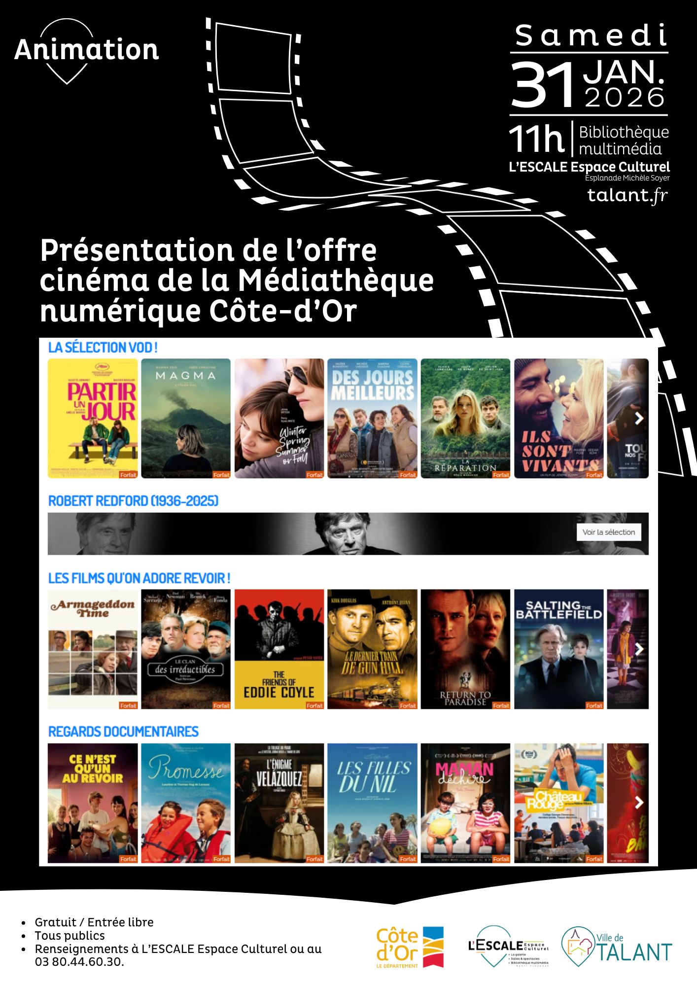 Venez assister à une présentation de l'offre cinéma gratuite proposée par la Médiathèque numérique Côte-d'Or en partenariat avec la Bibliothèque multimédia Henri Vincenot.